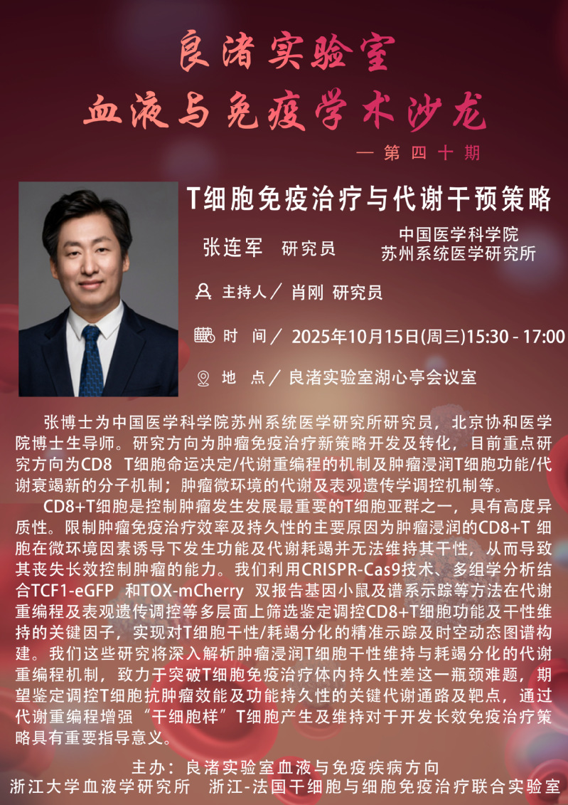 张连军博士,中国医学科学院苏州系统医学研究所研究员,北京协和医学院博士生导师。研究方向为肿瘤免疫治疗新策略开发及转化,目前重点研究方向为CD8 T细胞命运决定/代谢重编程的机制及肿瘤浸润T细胞功能/代谢衰竭新的分子机制;肿瘤微环境的代谢及表观遗传学调控中国医学科学院苏州系统医学研究所研究员,北京协和医学院博士生导师。江苏省“333工程”中青年领军人才(第二层次)。中国抗癌协会肿瘤生物治疗委员会委员;中国免疫学会肿瘤免疫与生物治疗分会委员;中国生物物理学会肿瘤免疫生物学分会委员。主持国家自然科学基金委原创探索计划项目(2023);国家自然科学基金委面上项目(2019;2022);国家重点研发计划课题骨干(2022);江苏省杰出青年项目(2022)。Ageing and Cancer Research & Treatment , Translational Oncology编委;Immunity , Cell Metabolism等杂志评审专家。研究方向为肿瘤免疫治疗新策略开发及转化,目前重点研究方向为CD8 T细胞命运决定/代谢重编程的机制及肿瘤浸润T细胞功能/代谢衰竭新的分子机制;肿瘤微环境的代谢及表观遗传学调控机制等。以最后通讯作者在Immunity (2025) , Cellular & Molecular Immunology (2025, 2023, 2021),Cell Reports Medicine (2025) , Cell Metabolism (2025,2020) , Trends in Cancer (2025, 2020) 等杂志发表SCI论文20余篇,共发表文章60余篇,他引5400多次。